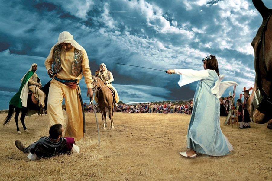 Las afueras de la ciudad se convierte en un improvisado escenario al aire libre. La representación consiste en un simulacro de batalla a caballo entre cuatro moros y cuatro cristianos. Los moros intentan invadir el pueblo y hacerse con la imagen de la Virgen de la Cabeza, algo que los cristianos no les van a permitir. Durante la actuación se van recitando versos y textos religiosos. La batalla culmina con la aparición de un ángel que convierte al cristianismo a uno de los moros.