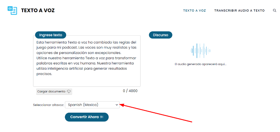 A continuación, introduce el texto que deseas convertir a voz en la casilla correspondiente. Si lo desea, también puede cargar un documento.