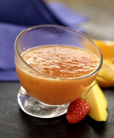 Lavar las fresas y pelar el mango.Picar todo, colocar en un cuenco y guardar en el congelador al menos 2 horas o, si es posible durante toda la noche. Una vez extraído del congelador, agregar el zumo de naranja y batir hasta lograr una salsa espesa. Servir en vasos de boca ancha.